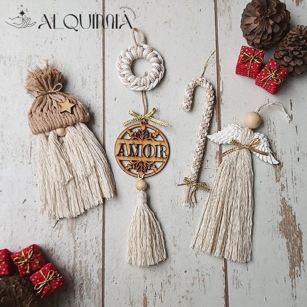 Set de 5 piezas realizadas en macramé, ideales para colgar en el arbolito de Navidad.
